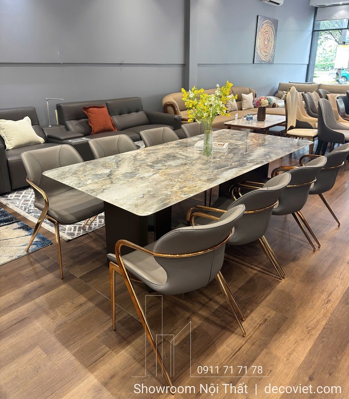 Bộ bàn ăn 8 ghế luôn là biểu tượng của sự đủ đầy và tiện nghi trong mọi không gian sống rộng rãi. Mẫu Bàn Ăn 8 Ghế Mặt Đá Chân Inox 2796S gây ấn tượng với mặt đá cẩm thạch tự nhiên xuyên sáng sang trọng, đường vân tự nhiên sắc nét và bộ ghế chân inox vàng hồng thời thượng, tạo cảm giác thoải mái khi sử dụng lâu dài. Sự hòa quyện giữa đường nét tinh tế và chất liệu cao cấp giúp bộ bàn ăn 8 ghế hiện đại trở thành điểm nhấn nâng tầm phòng ăn. Tại Nhà Decor, anh/chị có thể dễ dàng chọn được mẫu bàn ghế ăn “đúng gu – đúng chất – đúng không gian” với hơn 100+ mẫu có sẵn, giao hàng nhanh toàn quốc.