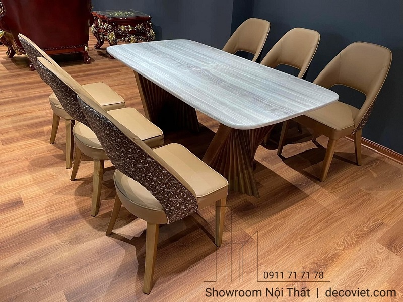 Là một trong những mẫu bàn ăn đẹp được yêu thích nhất tại DecoViet, Bàn Ăn Mặt Đá Cao Cấp dễ dàng kết hợp hài hòa với các món đồ nội thất trong phòng như thảm trải sàn, ghế ăn, tủ trang trí. Ngoài ra, dáng bàn ăn này còn có thể kết hợp với mặt bàn đá giúp không gian thêm sang trọng và tinh tế hơn.