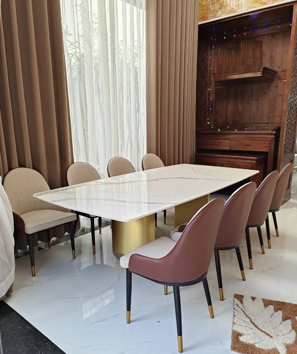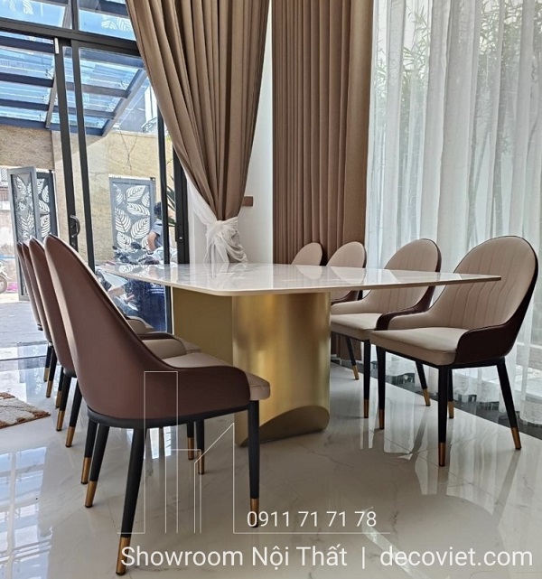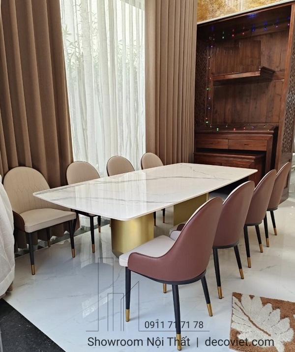 Nền nã, chắc chắn và sang trọng chính là những gì có thể miêu tả về bộ bàn ghế ăn 8 người này. Mặt bàn bằng chất liệu đá nhập cao cấp chống thấm sử dụng bền bỉ. Ngoài ra mặt bàn hình chữ nhật và mặt đá màu trắng vừa tạo không gian ấn tượng và sang trọng hơn.