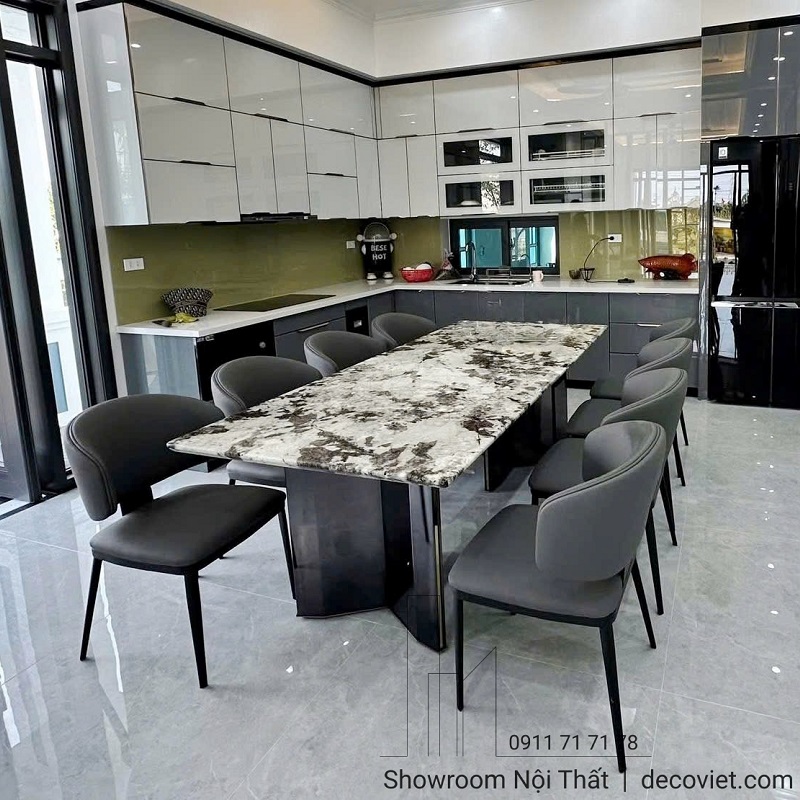 Gây ấn tượng với mặt bàn đá vân tự nhiên nổi bật, bộ bàn ăn mặt đá 8 ghế tạo chiều sâu và cảm giác cao cấp cho không gian bếp. Kích thước bàn dài 2.4m rộng rãi, phù hợp cho 8–10 người ngồi thoải mái, lý tưởng cho những bữa ăn gia đình đông người hoặc các buổi họp mặt cuối tuần. Thiết kế chân bàn inox chắc chắn, form dáng gọn gàng giúp tổng thể không gian luôn cân đối và thông thoáng.