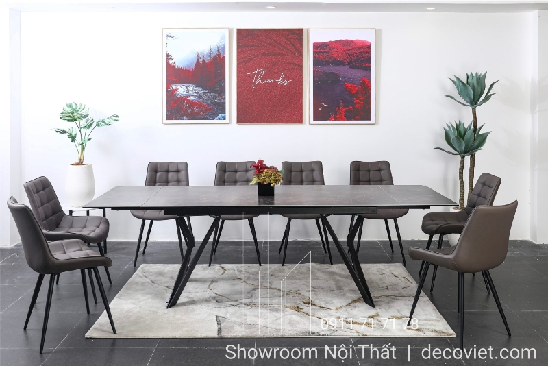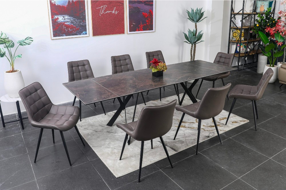 ▶ Bàn ăn chân sắt sơn tĩnh điện thiết kế hiện đại cùng với mặt đá ceramic sáng bóng giúp không gian bếp nhà bạn thêm sang trọng, tiện nghi.