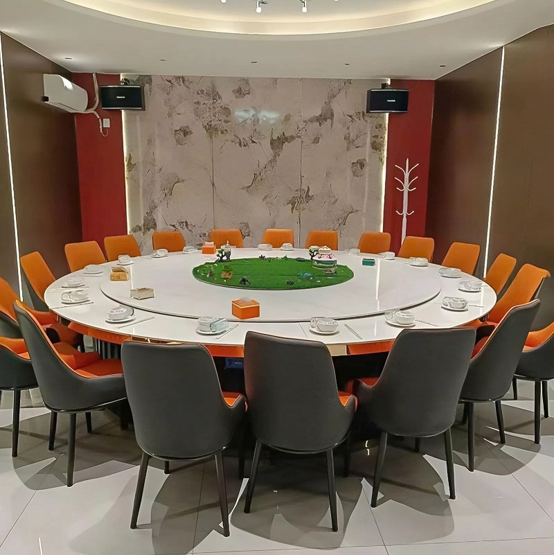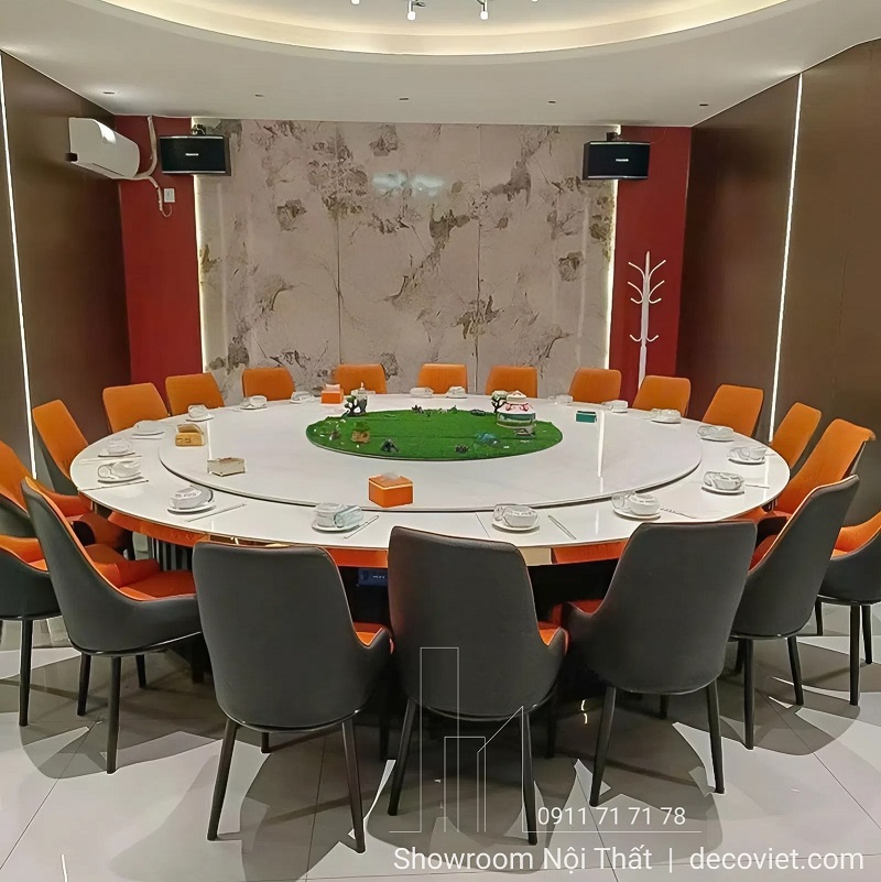 – Bàn ăn tròn 10–20 người phù hợp cho không gian nhà hàng, phòng tiệc, hội nghị hoặc khu vực VIP.