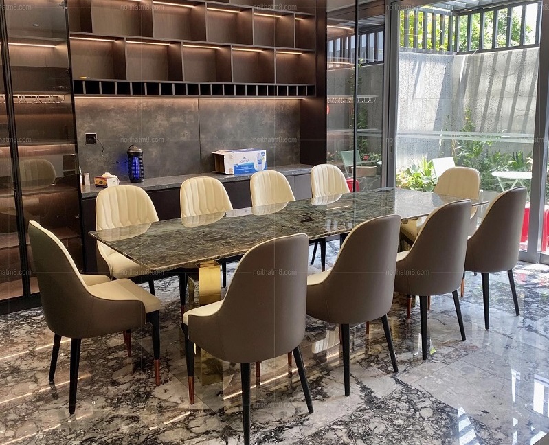 Bàn ăn 10 người là một trong những lựa chọn lý tưởng của giới thượng lưu. Bàn ăn mặt đá 8 ghế mang đến sự sang trọng, đẳng cấp trong từng đường nét cửa sản phẩm. So với những mẫu bàn ăn inox 10 ghế khác thì dòng bàn ăn mặt đá hiện đại này mất rất nhiều thời gian, sự đầu tư công phu nhất.