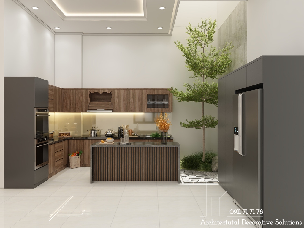 Khu vực nhà bếp cần sắp xếp để có sự hài hòa với tổng thể kiến trúc của nhà phố. Thông thường, kiểu bếp phổ biến và được yêu thích nhất là phòng khách liên thông bếp. Bên cạnh đó, nội thất của nhà bếp cần phù hợp với phong cách trang trí ở phòng ăn lẫn khu vực tiếp khách. Có thể thiết kế tủ bếp hình chữ I hay L tùy theo diện tích cụ thể của không gian bếp nhà bạn. Màu sắc mà tủ bếp mang lại có thể tự lựa chọn như: Màu trắng, đen hay trùng màu với sàn nhà.