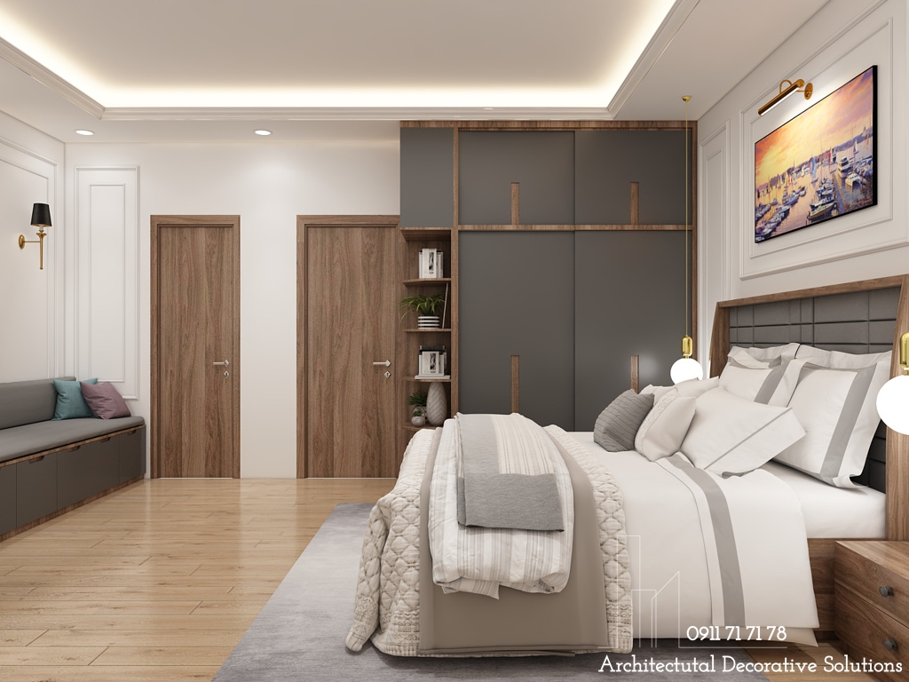Phối cảnh 3D nội thất căn hộ 2PN sang trọng tại Thủ Đức - Phòng ngủ dành cho vợ chồng khi trang trí cần có sự đồng nhất về phong cách tổng thể chung của căn hộ để làm tăng tính thẩm mỹ cho căn phòng. Một điểm nữa bạn cần chú ý là: Đồ dùng cho phòng ngủ thì nên chọn những đồ thật sự cần thiết như giường, bàn phấn trang điểm, tủ quần áo để tạo sự rộng rãi cho phòng ở. Tránh việc vào phòng đã thấy chật chội, bí bức và khó chịu.